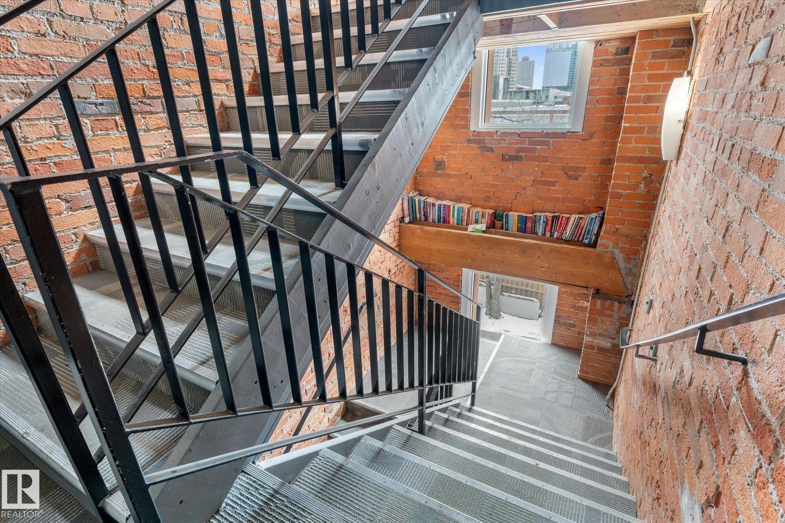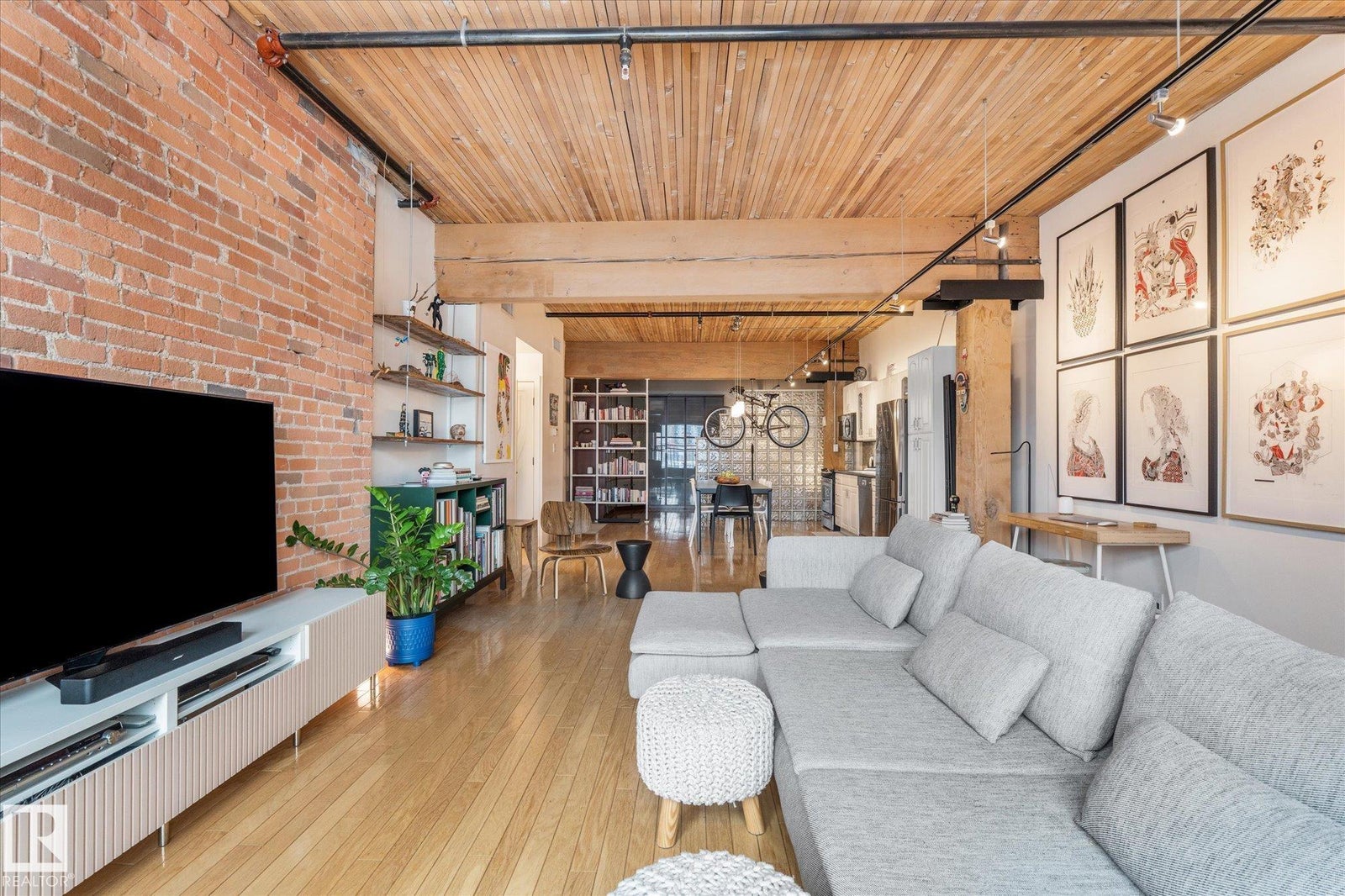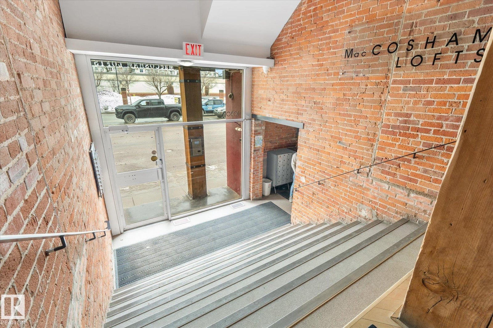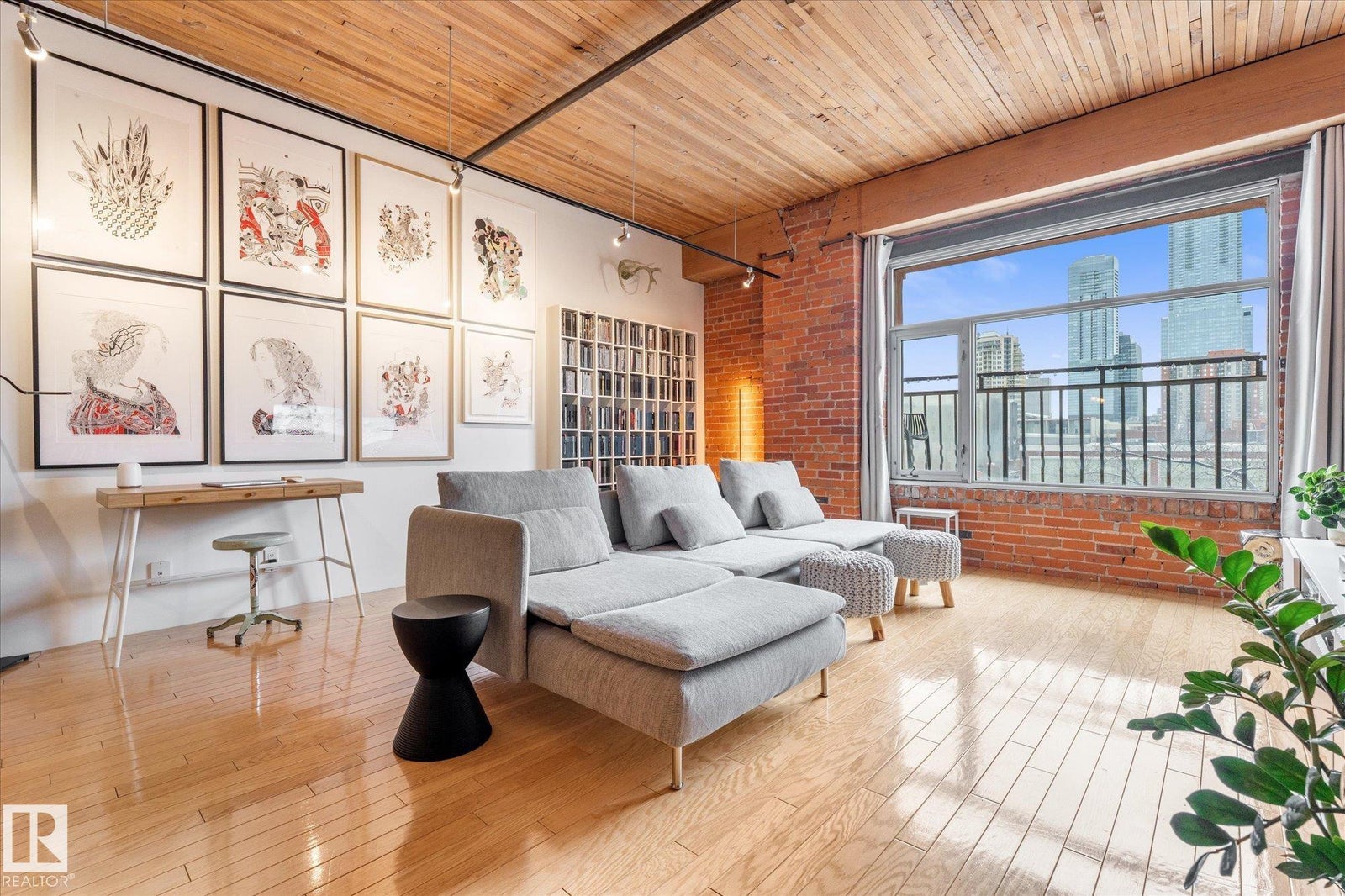 Discover urban living in this stunning hard loft condo conversion in downtown Edmonton, located just off 109 St and 104 Ave. Spanning over 800 square feet, this unique residence features original brick and wood beam accents, creating a unique vibe. Enjoy one of the few private balconies in the building, offering breathtaking views of the downtown skyline and stunning sunrises. The open-concept layout is ideal for entertaining and everyday living, with in-suite laundry and air conditioning for added convenience. Titled underground parking is included, and you'll be just moments away from Grant MacEwan University, Norquest College, the river valley, and Rogers Place, along with shopping and transit options. Experience the perfect blend of vibrant city life and serene living in this exceptional condo!