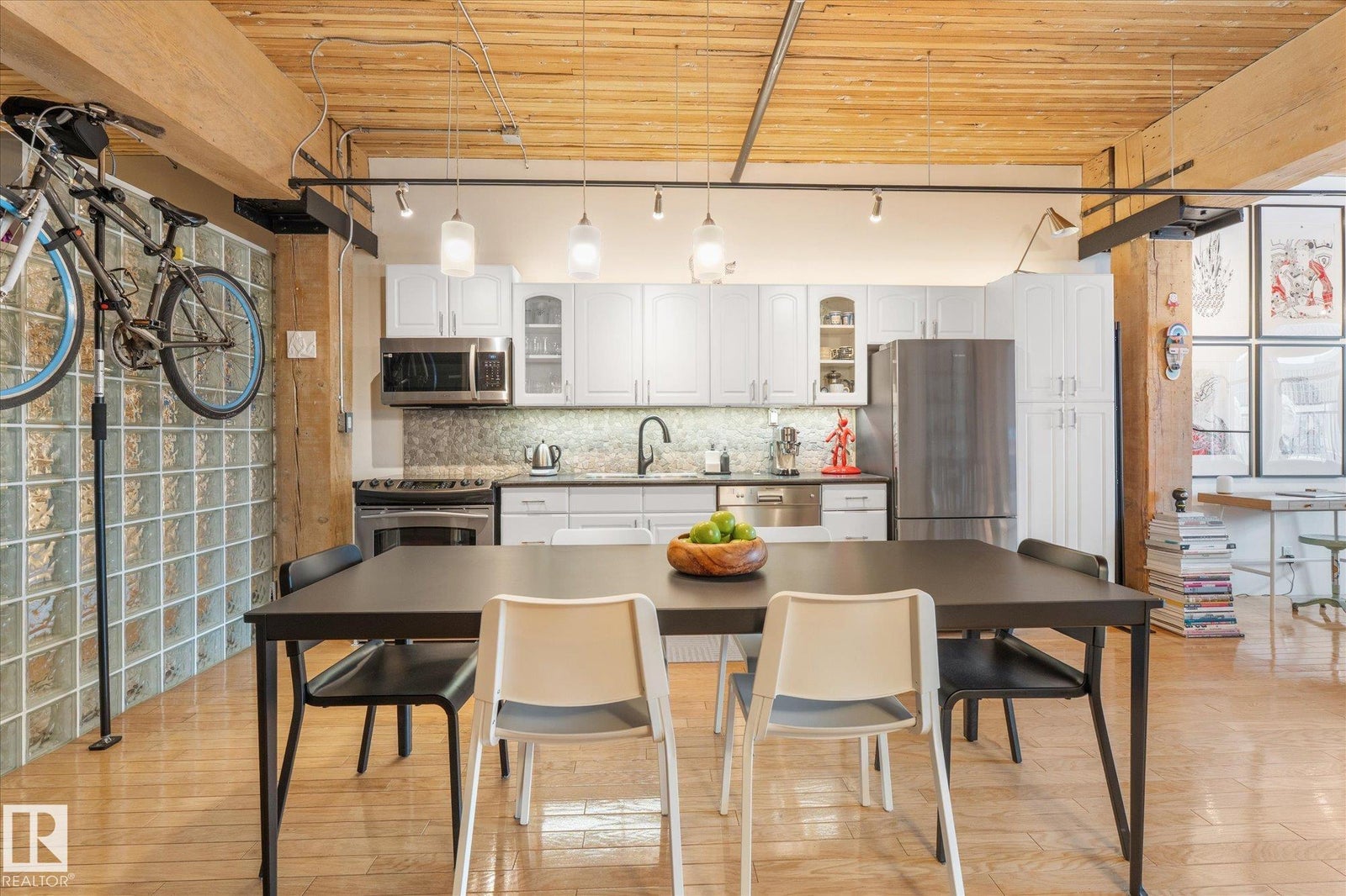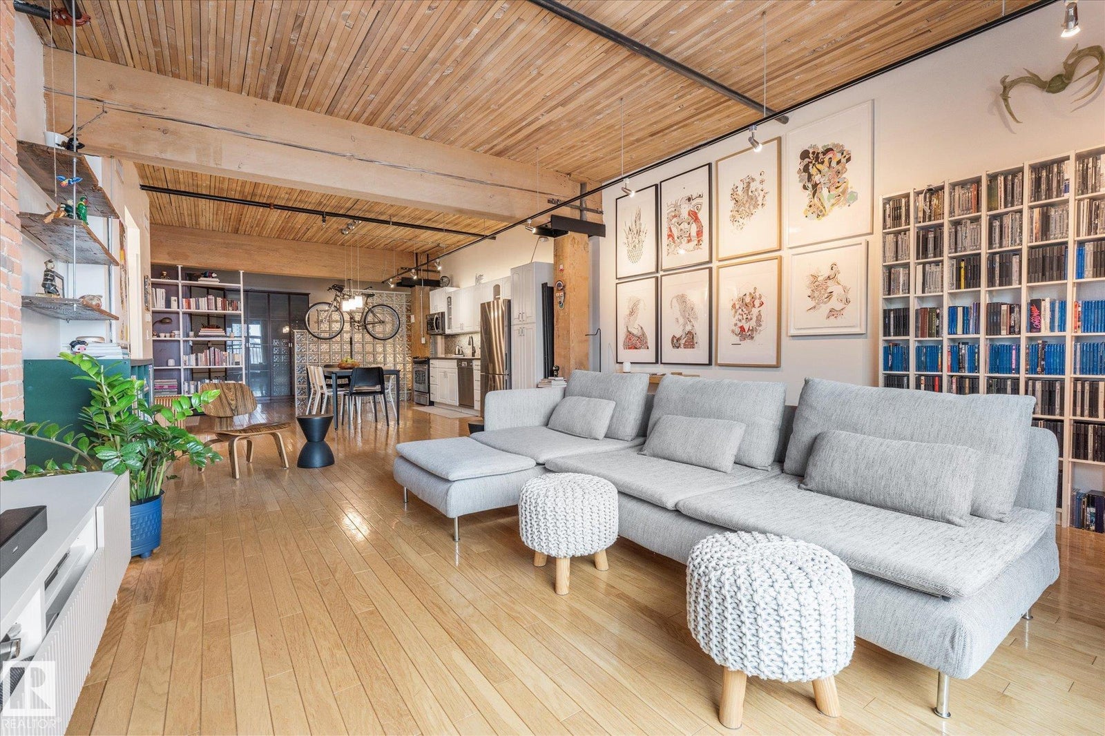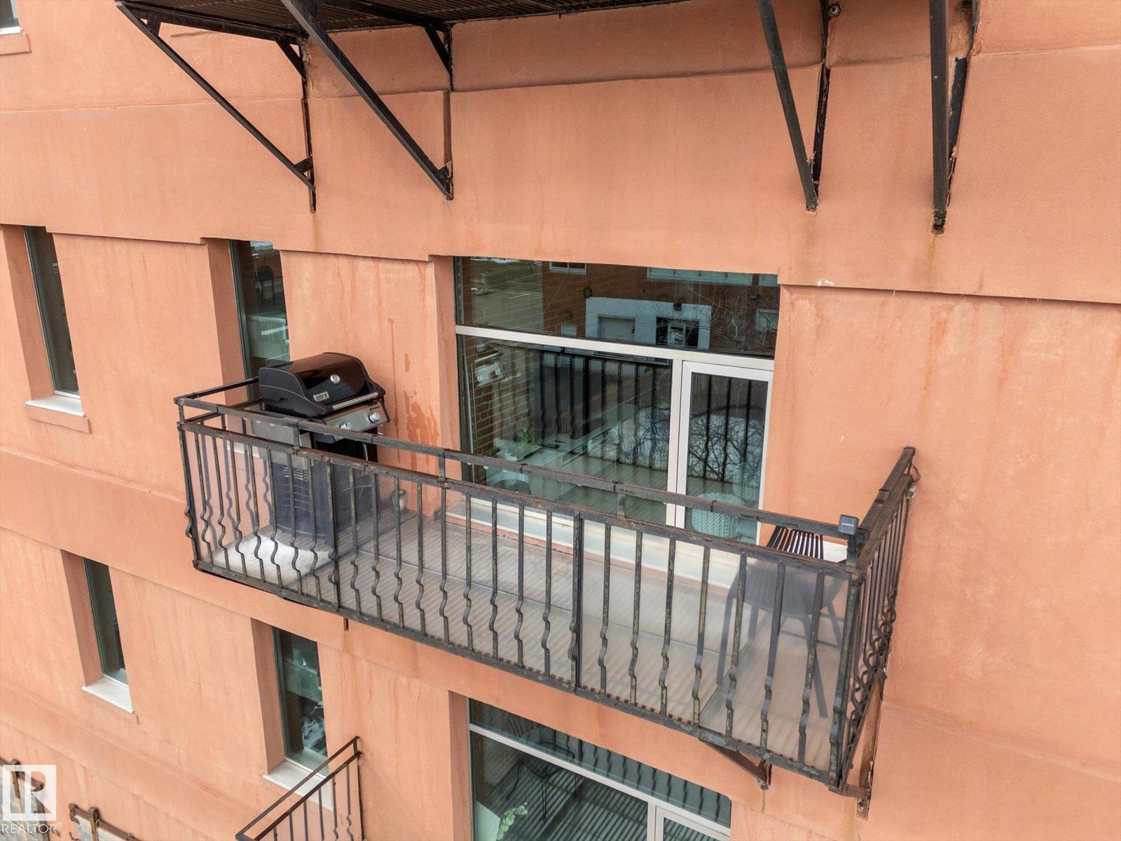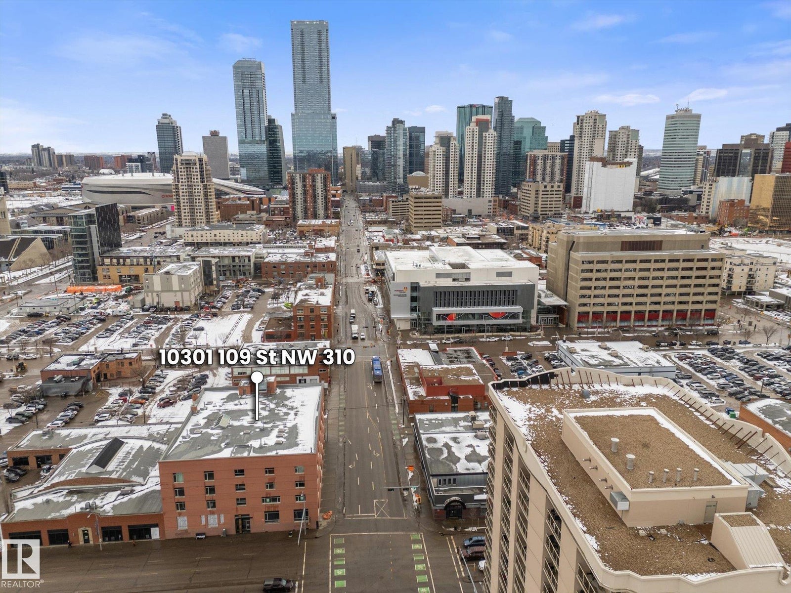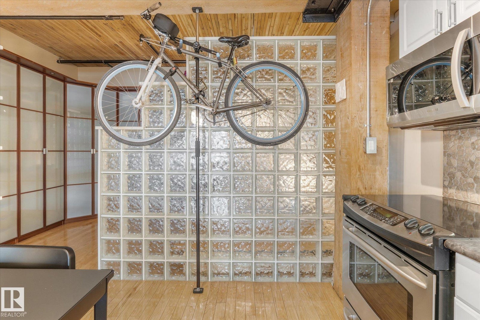 Discover urban living in this stunning hard loft condo conversion in downtown Edmonton, located just off 109 St and 104 Ave. Spanning over 800 square feet, this unique residence features original brick and wood beam accents, creating a unique vibe. Enjoy one of the few private balconies in the building, offering breathtaking views of the downtown skyline and stunning sunrises. The open-concept layout is ideal for entertaining and everyday living, with in-suite laundry and air conditioning for added convenience. Titled underground parking is included, and you'll be just moments away from Grant MacEwan University, Norquest College, the river valley, and Rogers Place, along with shopping and transit options. Experience the perfect blend of vibrant city life and serene living in this exceptional condo!