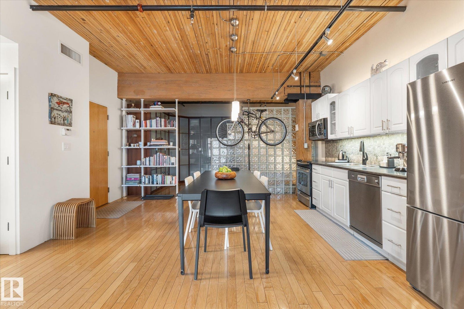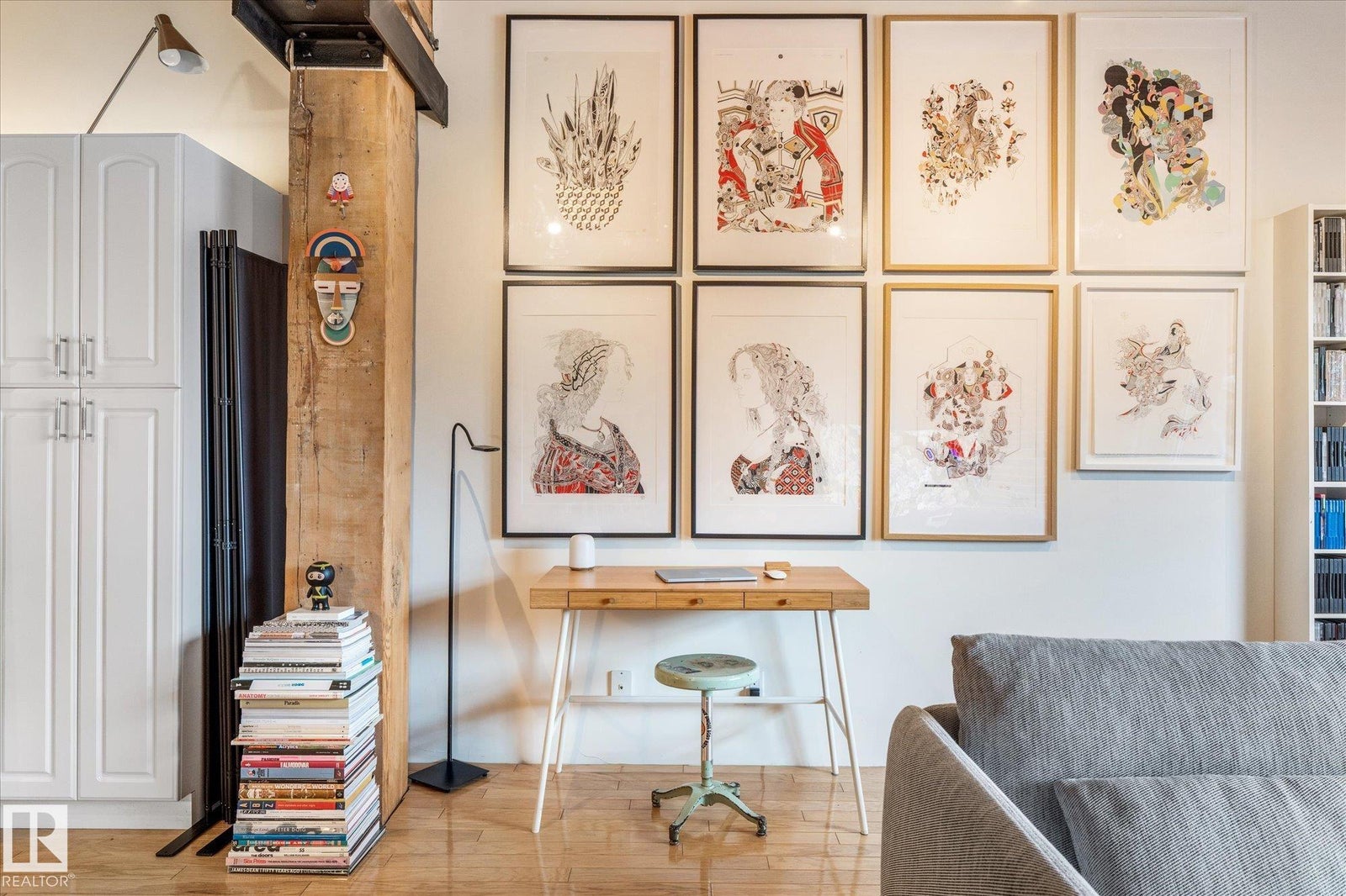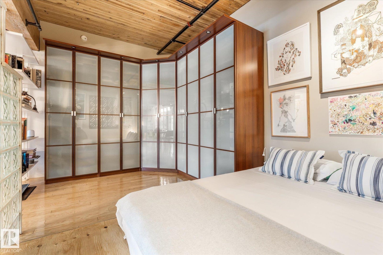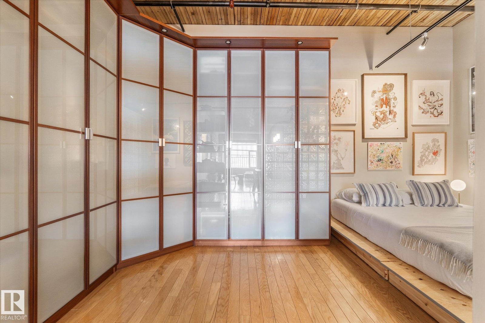 Discover urban living in this stunning hard loft condo conversion in downtown Edmonton, located just off 109 St and 104 Ave. Spanning over 800 square feet, this unique residence features original brick and wood beam accents, creating a unique vibe. Enjoy one of the few private balconies in the building, offering breathtaking views of the downtown skyline and stunning sunrises. The open-concept layout is ideal for entertaining and everyday living, with in-suite laundry and air conditioning for added convenience. Titled underground parking is included, and you'll be just moments away from Grant MacEwan University, Norquest College, the river valley, and Rogers Place, along with shopping and transit options. Experience the perfect blend of vibrant city life and serene living in this exceptional condo!